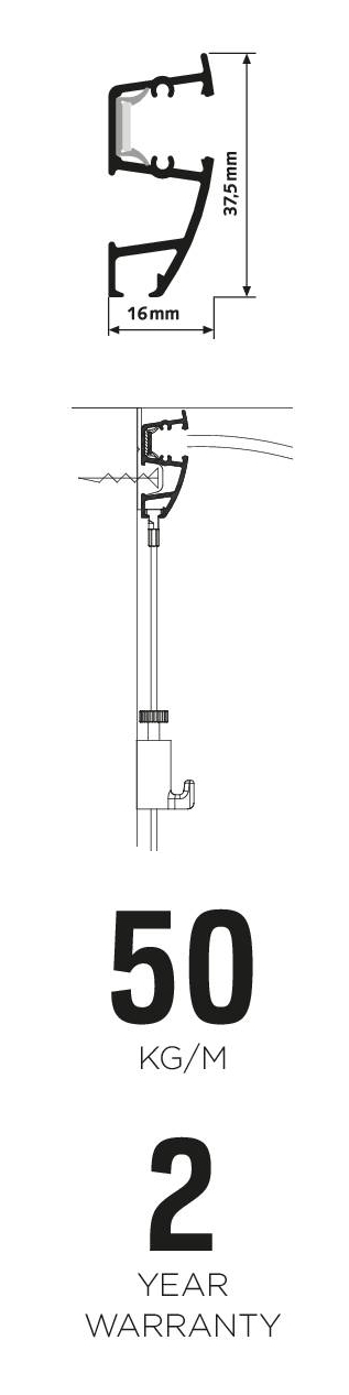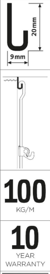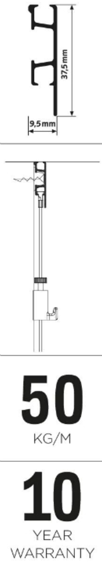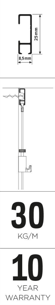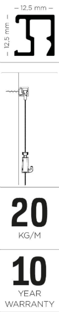 Den är framtagen för att hänga tunga konstverk upp till 100 kg/m. Denna typ av skena förekommer på många gallerier och museum värden över. Den är utformad för att användas med fasta 4mm stavar i stål eller aluminium med skjutbara krokar som finns för olika tyngder. Vill du hänga lättare konstverk kan denna skena kompletteras med en S-krok och tråd samt valfri bildkrok.