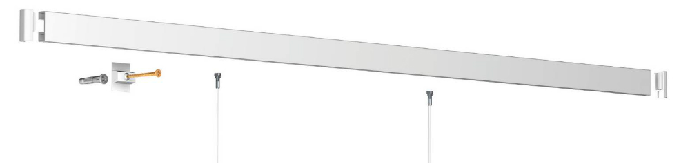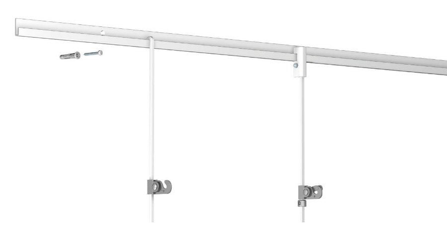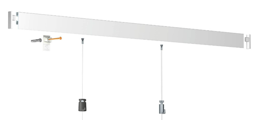 Fantastisk när du har hopplöst hårda betongväggar. Skenan ihop med tråd och bildkrokar gör att du alltid kan prova dig fram till den ultimata hängningen för din vägg utan att göra nya stora hål! Väggfästena är unikt platta och används som mall för snabb och enkel uppsättning av skenan tätt mot taket. Skenan döljer väggfästena, är målningsbar och mycket diskret och närmast osynlig på väggen. Fungerar både i hemmiljö, offentlig miljö och gallerier.